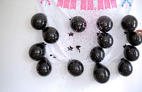 ? HOW TO SET UP – Hang the tapestry on any fence, wall or plywood board. Inflate 11 black balloons. If it’s a GIRL inflate 3 PINK confetti filled balloons and 2 BLUE confetti filled balloons. If it’s a BOY inflate 3 BLUE confetti filled balloons and 2 PINK confetti filled balloons. Whether it’s a boy or a girl you’ll have 16 balloons total hanging on the tapestry.